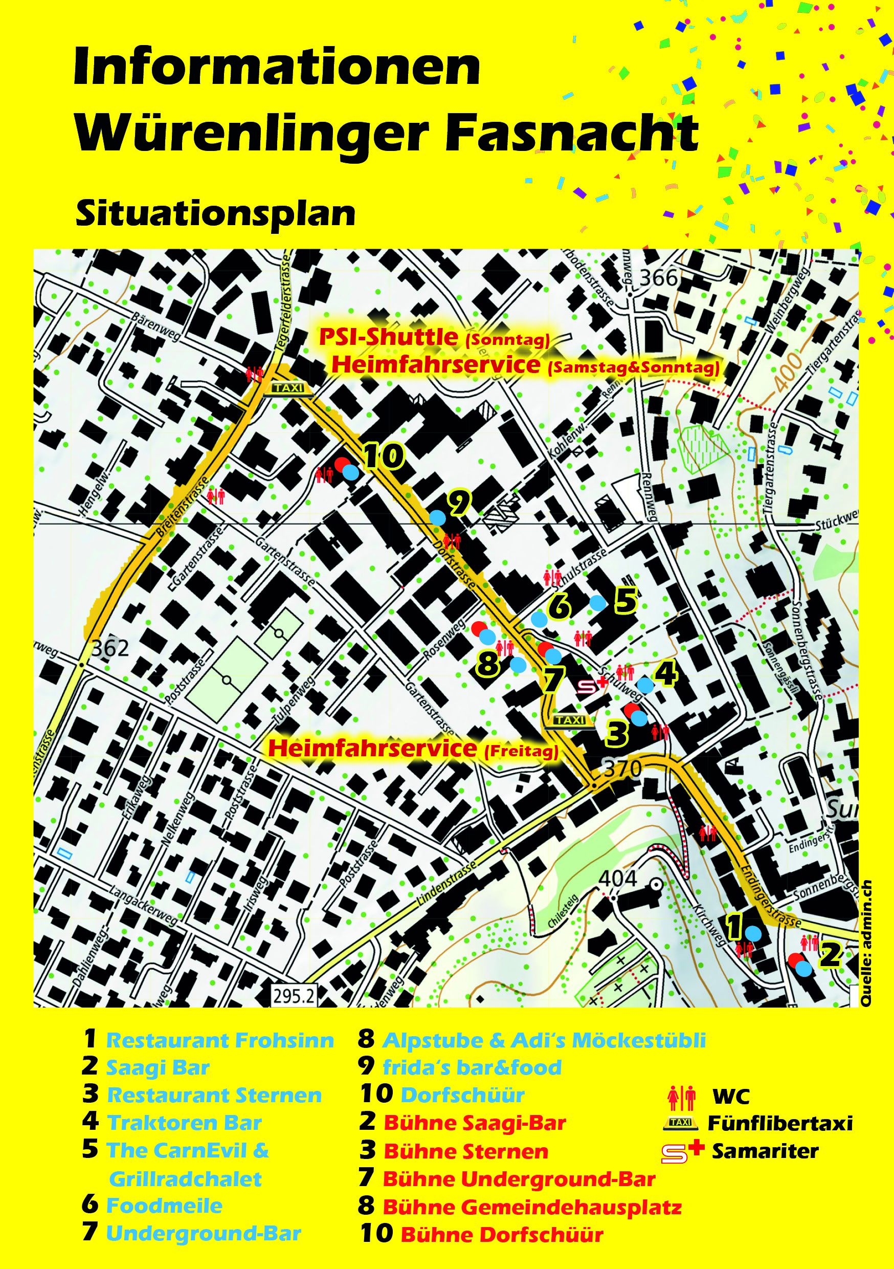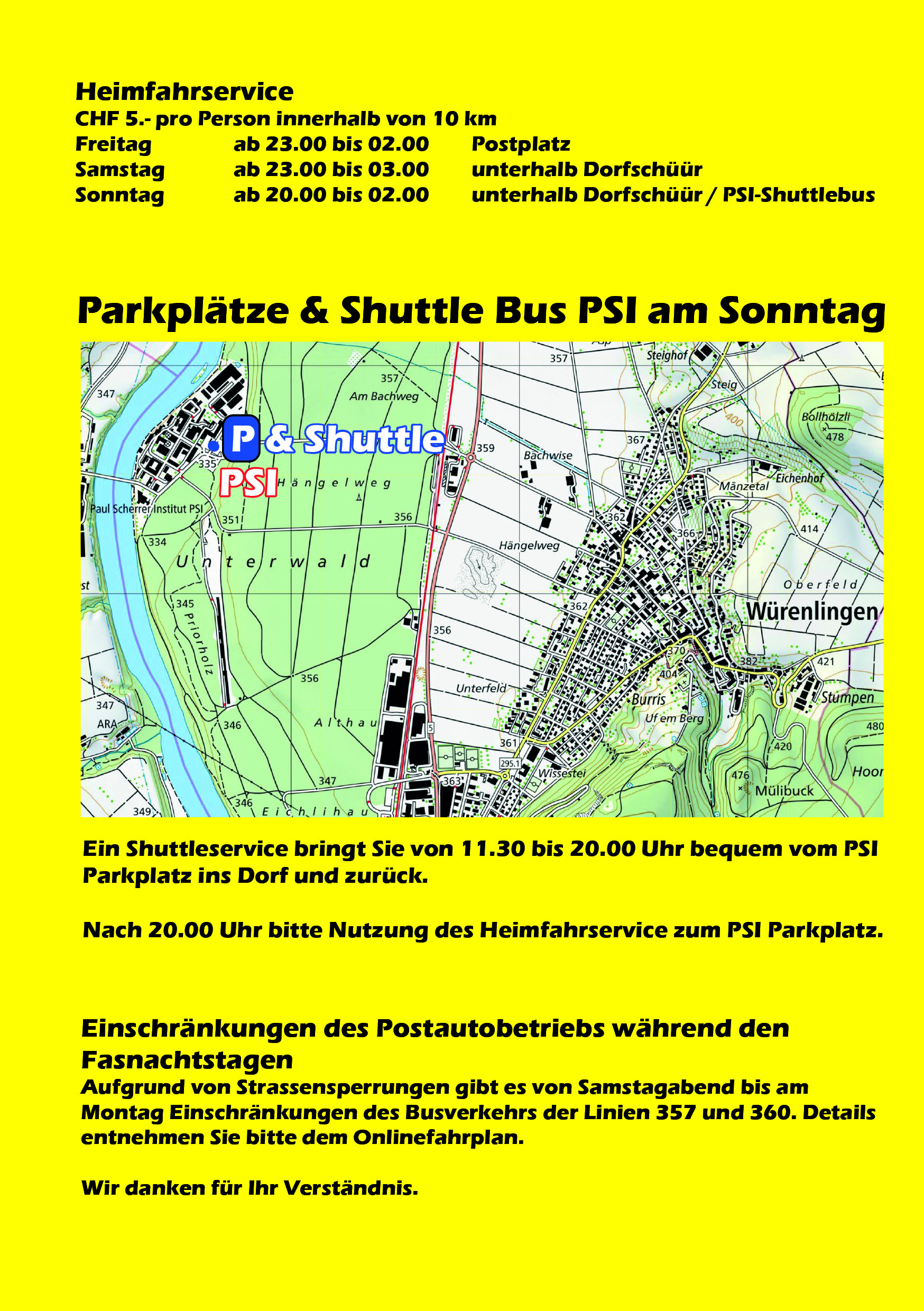 Wir haben eine neue Parkplatzsituation. Die Parkplätze befinden sich am Sonntag im PSI. Wir bieten einen Shuttle an, der Sie an die Umzugsroute bringt und wieder zurück.