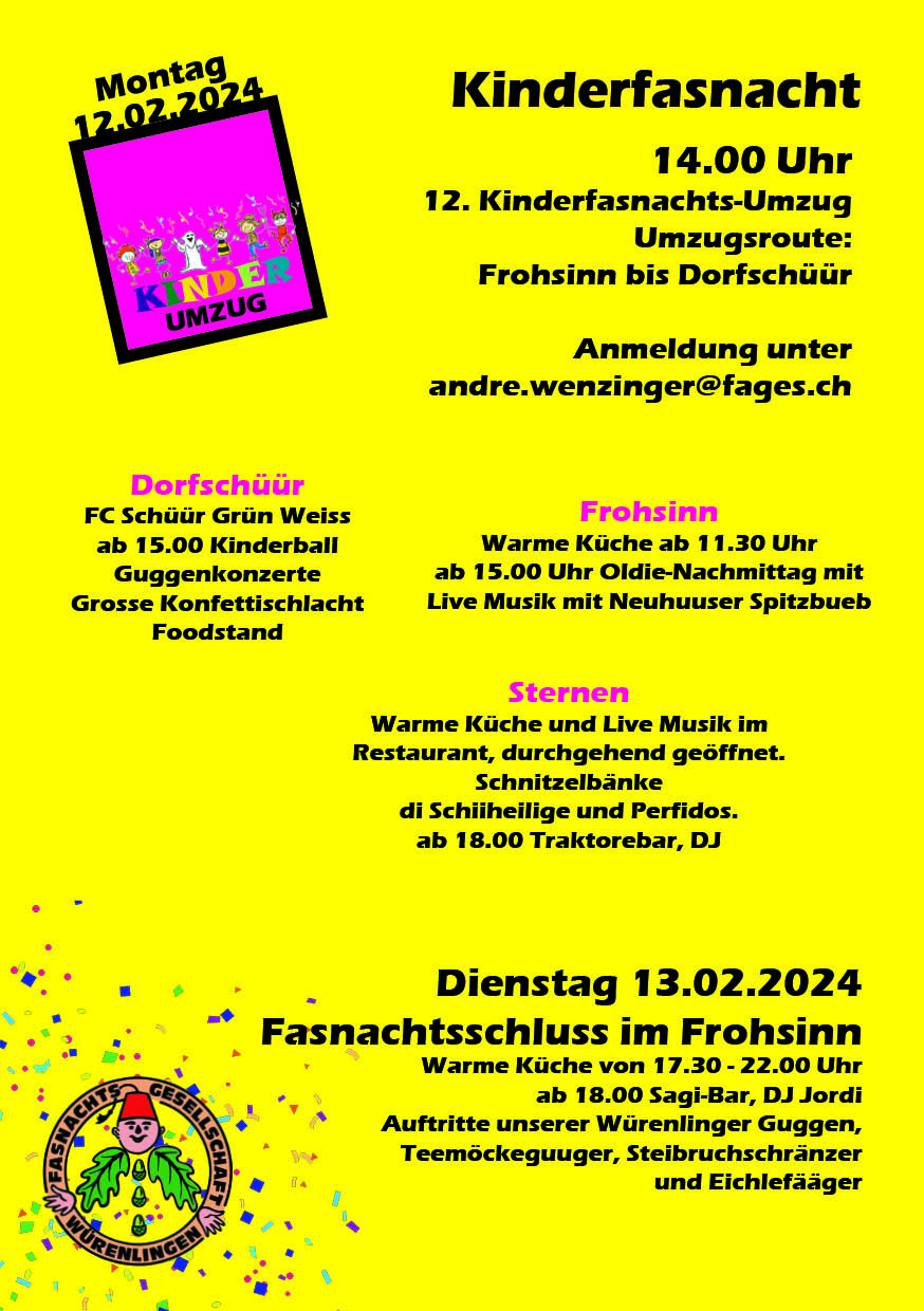 Bereits zum 15. Mal findet am Montag 08. Februar 2027 um 14:00 Uhr der grossartige Kinderumzug mit anschliessender Konfettischlacht statt.